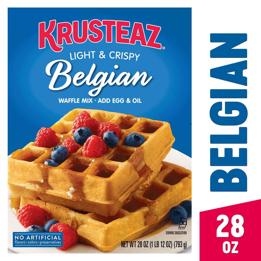 - DELICIOUSLY LIGHT: Take your taste buds on a trip abroad with Krusteaz Belgian Waffles. Enjoy the crispy outside and the warm sweet inside of a perfect, golden-brown Belgian waffle